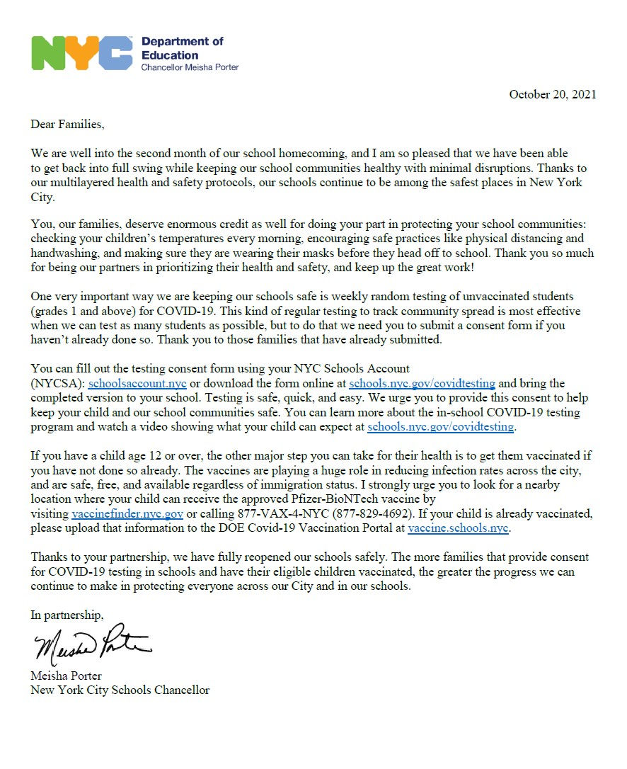 Letter from Chancellor PorterPrincipal La SalaOct 20, 20211 min readPlease read the following message from our Chancellor. Additional translations can be found here: Message for Families