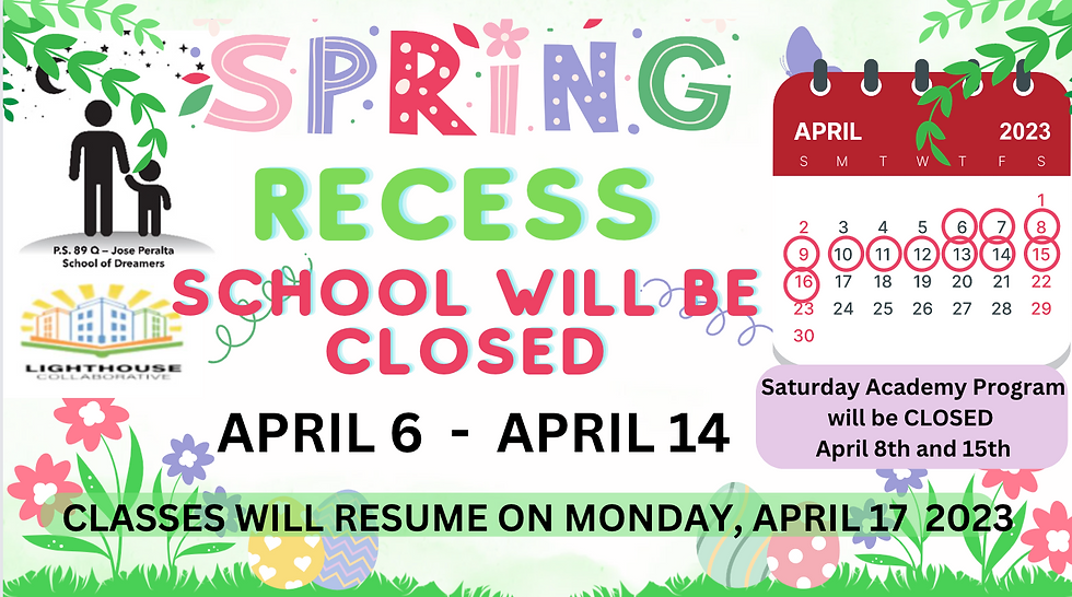Spring Break!Principal La SalaApr 5, 20231 min readPS 89 will reopen on April 17!¡PS 89 reabrirá el 17 de abril!